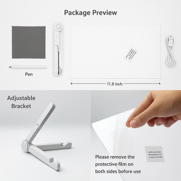 GlowNote™ LED Message Board,Adjustable Bracket Stand,USB Power Cable,White Neon Marker,Cleaning Cloth,User Guide + Setup Tips