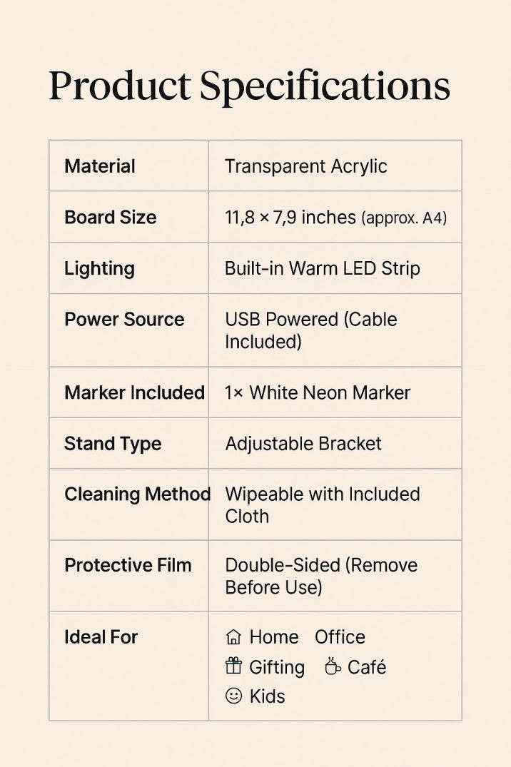 📋 Glows with to-do lists & reminders, 🍝 Highlights daily specials with charm ,♻️ Wipe & reuse — no mess ,💼 Looks smart on any counter or desk ,✍️ Quick edits, no tech needed